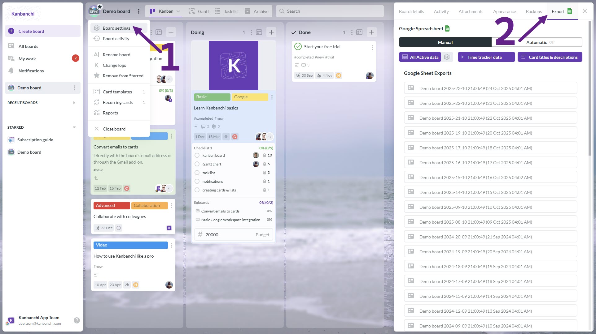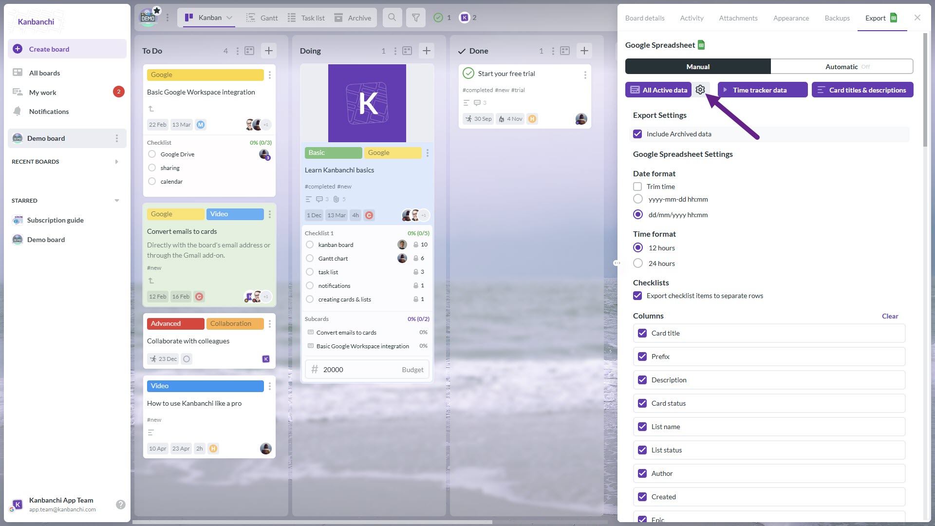 When the export is complete, we'll send you an email with a link to a new spreadsheet containing the exported data. You can also open it from your Google Drive. The file will be created in the folder for your board, inside the Kanbanchi folder in your Google Drive, with the board name and export date in the title. Depending on your board location, it may be a folder inside the Shared Drive.